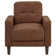 Simple yet thoughtfully detailed, this sofa set brings comfort and structure to compact spaces. Slim track arms with cord welt trim frame grid-tufted back cushions, while soft, textured upholstery creates a relaxed and inviting feel. Pocket coil seating offers lasting support, and tapered round legs provide a lifted foundation. Tailored and timeless, this collection is ideal for studio living or any room in need of space-conscious comfort. Key Features: • Sofa set with slim track arms and grid-tufted backs for clean lines and visual structure • Rust fabric adds soft texture and a versatile neutral tone to any room • Cord welt trim provides a tailored finish along arms and cushions • Pocket coil seating construction delivers consistent comfort and long-term support • Soft polyester upholstery is smooth, easy to care for, and family-friendly • Tapered round legs offer a stable, mid-century inspired lift to each piece