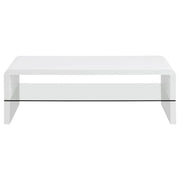 This ultra-modern coffee table showcases a sleek, high-gloss white finish and clean lines. Its rectangular tabletop flows seamlessly into waterfall edges, creating a contemporary silhouette. A clear tempered glass shelf offers an airy, open feel while providing functional storage. Perfect for displaying books or decor, this table brings an art studio-inspired aesthetic to your space. Engineered wood construction ensures durability, while its polished look elevates any living area with modern sophistication. Key Features: • Coffee table with ultra-modern, rectangular waterfall design • High-gloss white finish for a polished, contemporary look • Clear tempered glass shelf adds storage with an open, airy feel • Engineered wood construction offers long-lasting durability • Perfect for showcasing books and decorative pieces • Creates a sleek, artistic aesthetic for modern living spaces