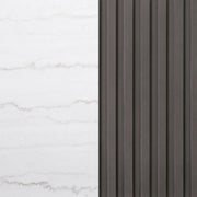 Center your living space with this elegant, modern round coffee table. The genuine white marble top exudes sophistication with its subtle veining, adding organic flair. The clean, light coloration complements any surrounding decor. A ribbed, engineered wood frame in a charcoal finish creates texture and depth, while the brushed gold metal base brings a luxurious touch. This piece seamlessly blends refined materials and design, making it the perfect addition to your living room. Key Features: • Round coffee table with a genuine white marble top and engineered wood frame • Subtle veining on the marble surface adds an organic, sophisticated touch • Charcoal finish on ribbed base enhances texture and creates depth • Brushed gold metal base offers a stylish and durable foundation • Versatile design complements a wide range of interior decor styles • Ideal for adding a contemporary, luxurious appeal to your living room