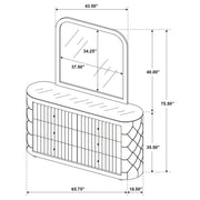 Wrapped in a cloud of boucle and gleaming detail, this dresser and mirror set transforms any bedroom into a personal sanctuary. Diamond tufting along the sides sparkles with embedded crystal accents, while vertical channeling on each drawer adds tailored rhythm and depth. Topped with a sleek mirror framed in matching fabric, the design offers a romantic balance of softness and structure, inviting both elegance and indulgence into everyday routines. Key Features: • Dresser and mirror set features plush boucle upholstery in a soft ivory tone throughout • Six drawers with vertical channeling offer bedroom storage and refined visual texture • Diamond-tufted sides embellished with crystal-style accents elevate the glam appeal • Clear tempered glass top offers a smooth, durable surface that enhances the look • Framed mirror matches the upholstered silhouette for a cohesive bedroom presentation • Crafted from solid rubberwood, engineered wood, boucle fabric, and foam for longevity