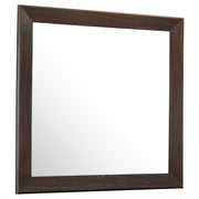 Mid-century modern-inspired, this sleek four piece bedroom set is transitional and versatile. Upholstered in brown leatherette, the bed frame features decorative stitching and block tapered legs. Complete with a nightstand, dresser, and mirror, this set warms up any contemporary motif with style. The six-drawer dresser and two-drawer nightstand feature contrast black recessed grooves. Open up a space with the smooth edges and charm of deep metallic hardware. Key Features: • Clean, minimalist bed upholstered in leatherette • Choose your color with versatile black, brown, and grey leatherette options • Solid rubberwood legs in black finish • Frame constructed with rubberwood and plywood • Box spring required