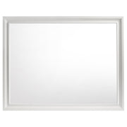 Encourage a glam vibe in your refined bedroom with a modern four-piece bedroom set. Centering on a stylish bed with an upholstered headboard and low footboard, the set includes a two-drawer nightstand for easy bedside storage and display space. A seven drawer dresser and mirror complete the set, adding diamond-like trim across its face that catches the light and offers a sophisticated touch. Bracket feet add a touch of dimensionality and movement to each piece and jewel-like bar pulls add intriguing sparkle. A cool white finish is textured, while white finish trim is smooth, creating a touch of textural contrast that add engaging style. Key Features: • Bedroom set with upholstered panel bed featuring glitter-accented headboard stripe • Textured white panel surfaces contrasted by smooth white molded trim throughout • Low profile footboard and bracket legs offer a modern and airy foundation • Storage cases include secret jewelry drawers behind glittery front panels • Drawers are felt-lined and glide on full-extension hardware for smooth operation • Crystal-style handles and sparkling trim provide glam-inspired sophistication