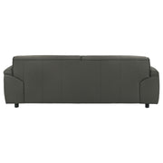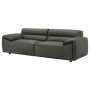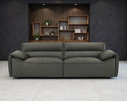 Sleek and sculptural, this leather-upholstered sofa blends minimalist form with elevated comfort. Wrapped in 100% genuine top grain leather, it offers a luxurious hand and timeless presence. Wide track arms and a low-profile frame shape a bold, architectural silhouette, while deep seating and padded back cushions provide an inviting place to unwind. Built with sinuous spring support and high-density full foam seating, it delivers lasting comfort wrapped in tailored sophistication. Key Features: • Sofa upholstered in 100% top grain leather for premium texture, durability, and refined comfort • Orange tone adds rich depth and modern character to any living space • Low-profile frame with wide track arms offers sculptural appeal and relaxed style • Deep seat cushions and padded backrests provide supportive lounging • High-density full foam seating ensures consistent comfort and lasting shape retention • Sinuous spring foundation delivers flexible support and balanced weight distribution